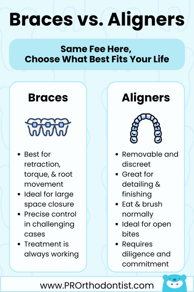 – Braces excel in: Severe rotations, deep bites, large spaces, or cases requiring maximum control.
