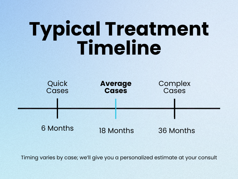 Most adult cases at Dadjoo Orthodontics take 9–18 months, depending on complexity. Simple crowding or spacing issues can finish in as little as 6–9 months, while comprehensive bite corrections may extend to 24 months. Dr. Dadjoo provides an exact timeline during your complimentary consultation using advanced ClinCheck simulation.